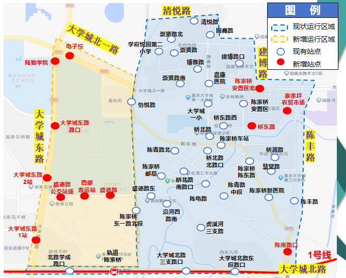 新增12个站点:陈南路口、大学城东路1站、大学城东路2站、大学城东路路口、陆勤学院、电子校、桥东路、陈家桥安置区北、廖家坪农贸市场、盛德路公交站场、西部客运站、盛德路。